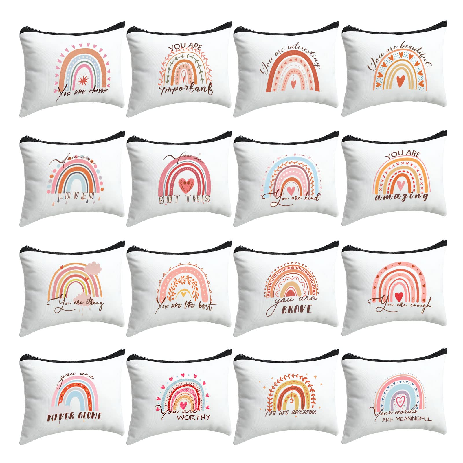 16 Pieces Rainbow Canvas Cosmetic Bag Bulk Inspirational Quotes Makeup Bags with Zipper Encouragement Travel Toiletry Pouch Appreciation Gift for Christmas Women Girls Teacher Birthday Graduation Gift