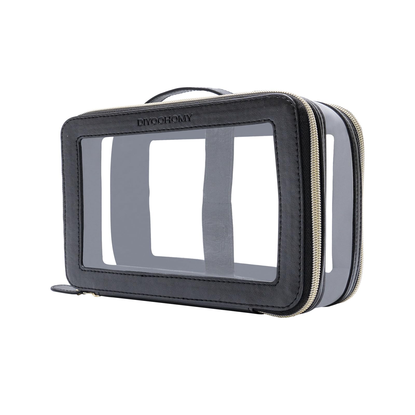 DIYOOHOMY Clear Makeup Bag Double Layer Two Sided With Zipper Black Cosmetic large Make Up Case Compartments Brush Travel Leather Toiletry Women Beauty Organizer Transparent Waterproof Pouch