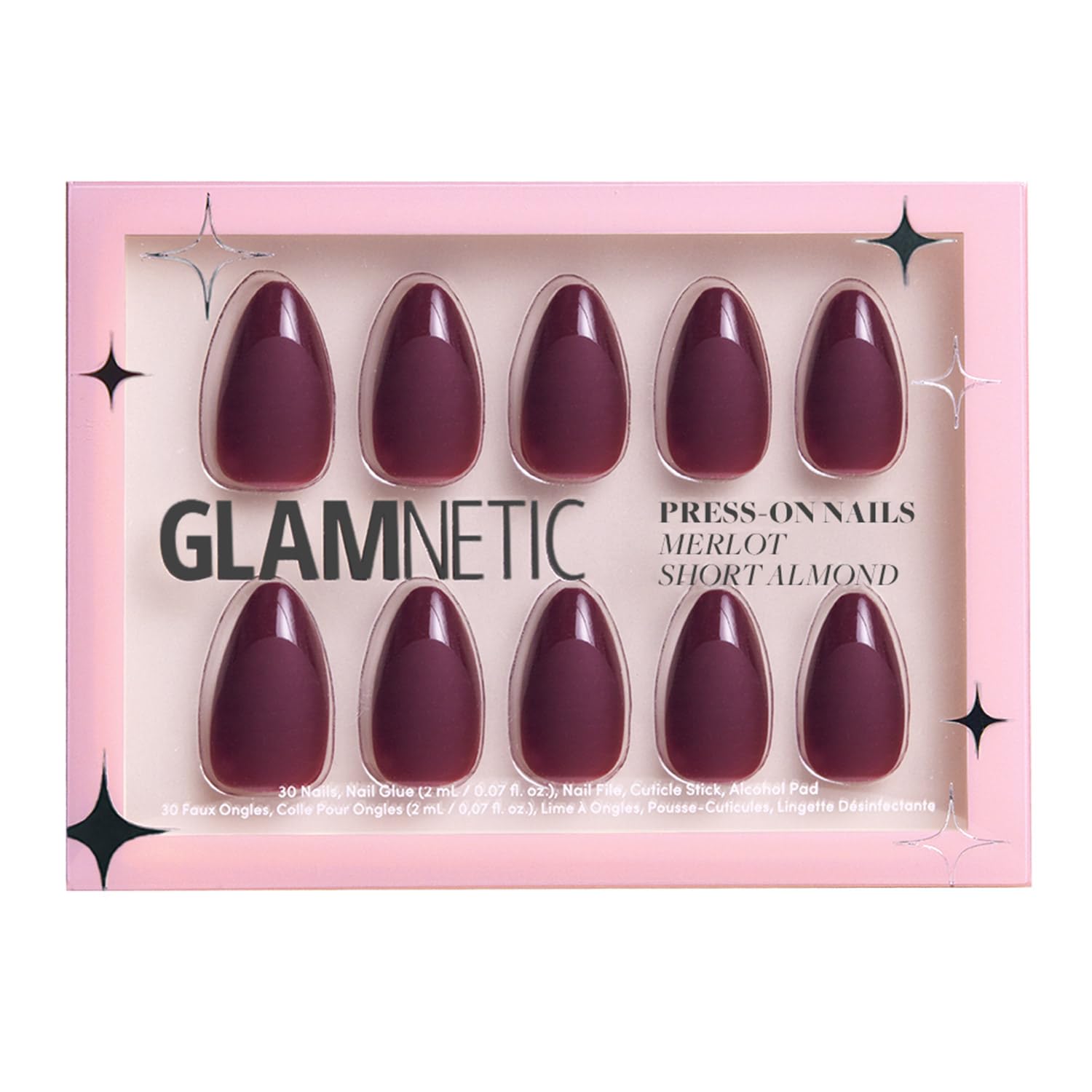 Glamnetic Press On Nails - Merlot | Short Almond Dark Red Nails with Glossy French Tips in a Matte Finish | 15 Sizes - 30 Nail Kit with Glue