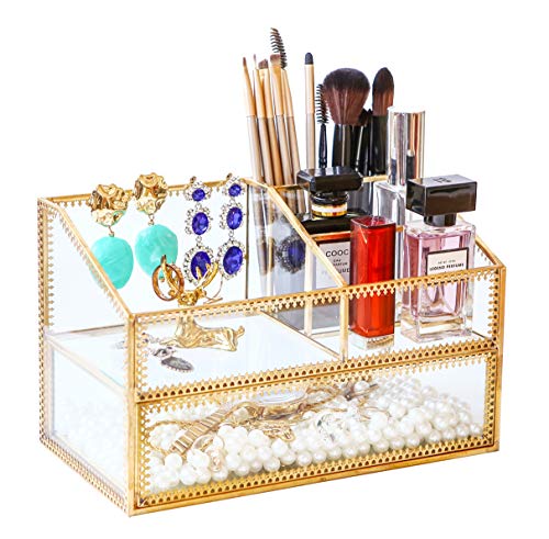 Golden Glass Box Vanity Tray Glass Case Makeup Display Organizer on Dresser, Multifunctional Cosmetic Storage for Palette Lipstick Makeup Brushes Skincare Perfumes Bathroom Accessories