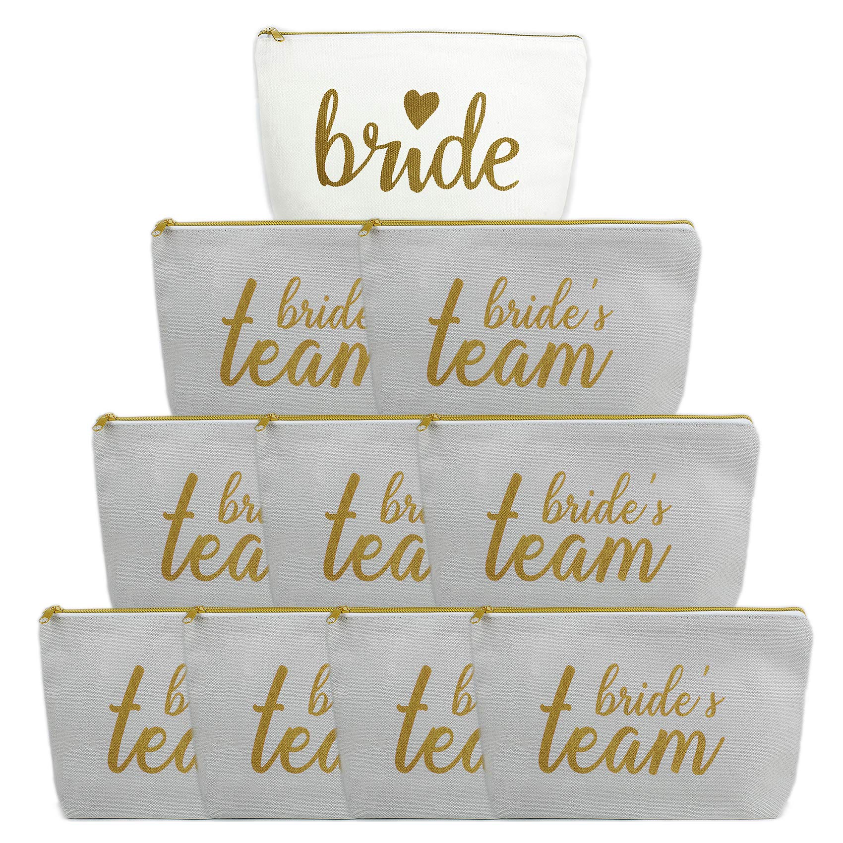 - 1.UNIQUE DESIGN——Set of 10 cotton canvas makeup bags with printed gold logo and gold zipper - perfect and fashion, including 1 piece of “Bride” white makeup bag, 9 piece of “Bride’s team” gray makeup bag, perfect for your bachelorette party essentials.