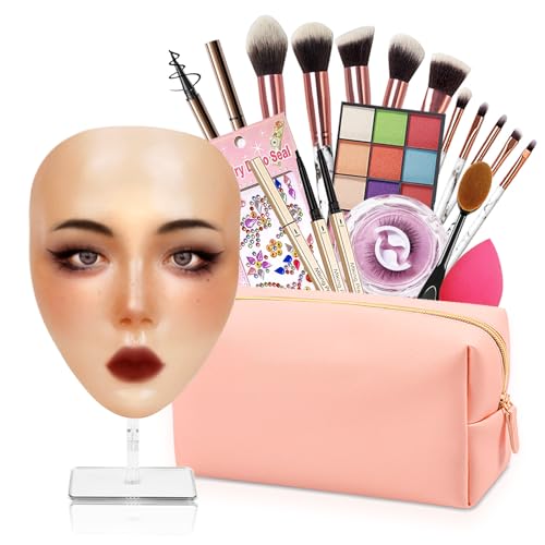 Makeup Mannequin Face, Makeup Practice Full Face, Silicone Makeup Practice Face Board with Makeup Kit & Face Gems & Makeup Brushes, for Beginners and Professionals to Practice Makeup or Girl's Gift