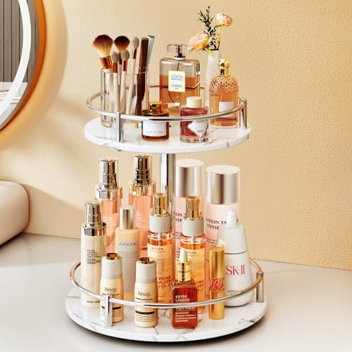 Makeup Skincare Organizer for Vanity - Rotating Perfume Cosmetic Display Bathroom Marble Tray 2 Tier Spinning Lazy Susan, White