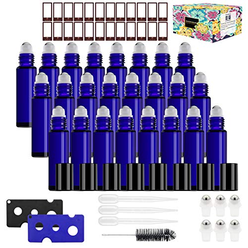 - ❀Glass Roller Bottles Value Sets - 24 Pack 10ml cobalt blue essential oil roller bottles with leak proof design metal roller balls and black caps. Including 24 Pieces Labels,1 Brush, 6 Extra Ordinary Roller Balls, 2 Openers, 3 Droppers. Perfect for essential oils, perfume oils, or other liquids.