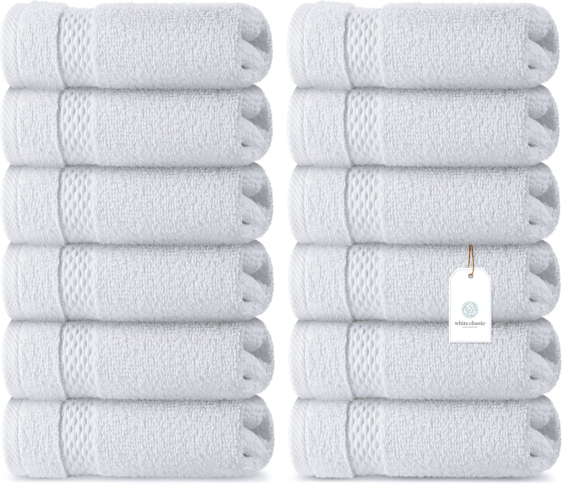 WhiteClassic Luxury Cotton Washcloths - Large Hotel Spa Bathroom Face Towel | 12 Pack | White
