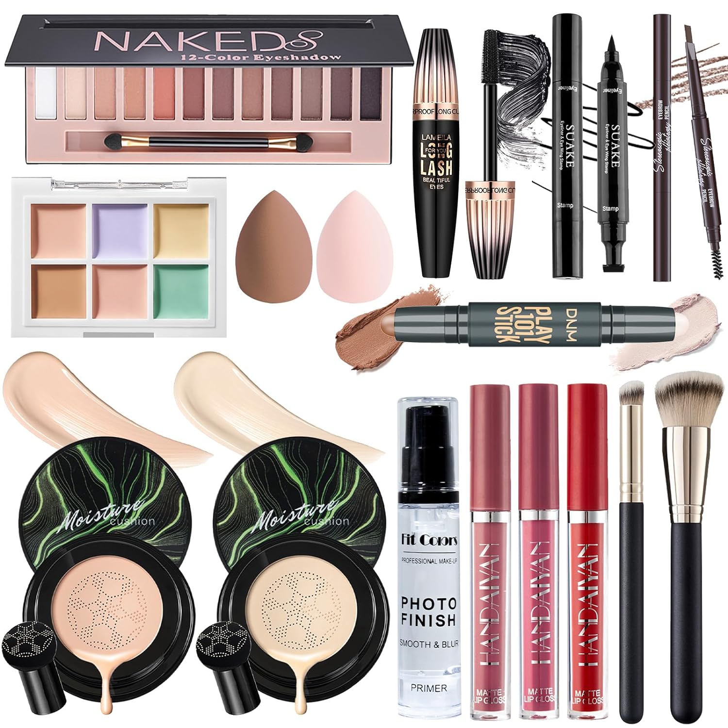 YBUETE All in One Makeup kit contains array of colors and cosmetic products. It is an ideal makeup gift for makeup beginner or even professional artist on Christmas, MotherÕs Day, Valentine's Day, Birthday, and other Festivals. Features: - Include all the basic and necessary makeup tools. - Formulated with high quality and safe materials, hypoallergenic and gentle for sensitive skins types. - Waterproof and smudge-proof, can last all day long. - High-pigmented and vibrant, various shades and styles, blendable and buildable, can easily match your own look. - An ideal makeup gift for women or girls, mothers or girlfriend, makeup beginners or professionals on all festivals. Package include: 1 _ 12 Colors matte naked eyeshadow palette 1 _ Natural mushroom head air cushion cc cream 1 _ Buff beige mushroom head air cushion cc cream 1 _ Face primer 3 _ Matte velvet liquid lipsticks 1 _ Dual-ended counter stick 1 _ 6 Color Concealer Palette 1 _ Retractable eyebrow pencil 1 _ Winged eyeliner stamp 1 _ Waterproof mascara 2 _ Makeup brushes 2 _ Makeup sponges